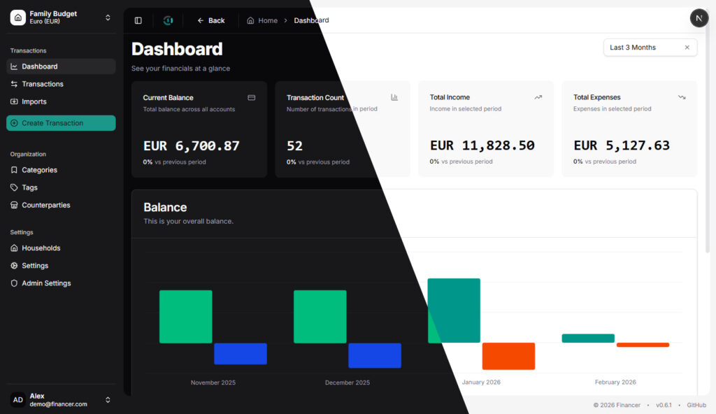 Financer is a self-hosted personal finance app built for households who value privacy. Track income and expenses, organize transactions with categories and tags, and gain insights through visual dashboards — all without relying on third-party services.